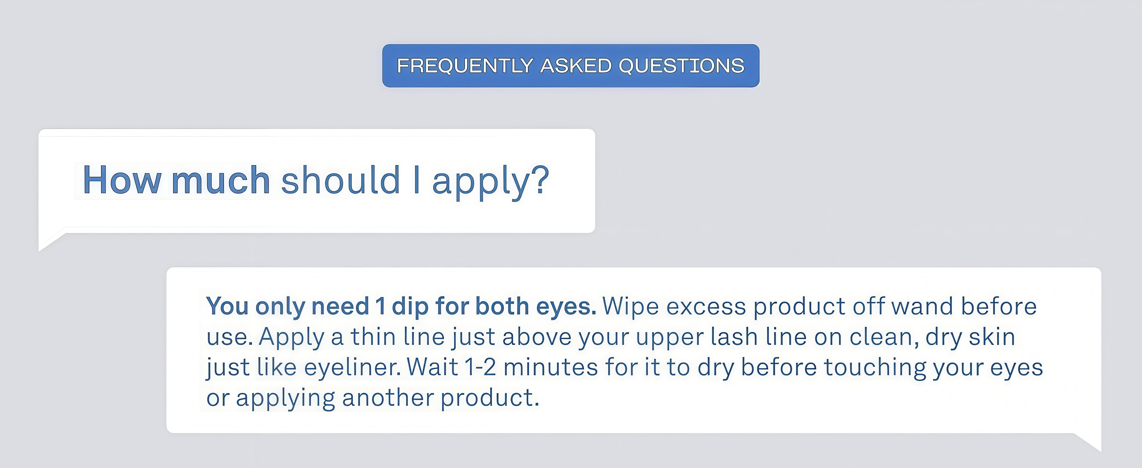 You only need 1 dip for both eyes. Wipe off any excess product from the wand before applying, then apply a thin line just above your upper lash line on clean, dry skin just like eyeliner. Wait 2-3 minutes for serum to dry before applying skincare, makeup, touching your eyes, or laying down.